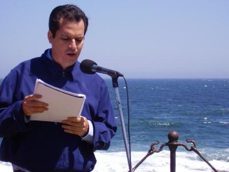 “De esas noches están plantadas/los arenales de tus playas tierra árida de noches/donde los mitos hidratan/leyendas, cantos de catedrales de arenas, donde el/gorrión atizado/aparea su hembra/donde el viento es azul/y la noche embruja noctámbula el coito/del utero, de sus labios violetas/con olores a placenta láctea/mientras el río se va haciendo nube/y el mar tierra”.