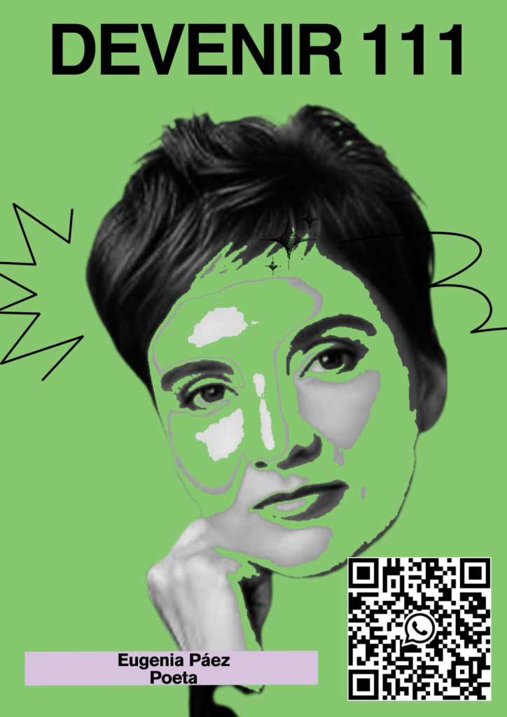Eugenia Páez, escritora, poeta, gestora cultural nacida en Córdoba y residente en Frías, Santiago del Estero, Argentina. Parte de su obra integra diferentes antologías provinciales, nacionales e internacionales. Ha publicado los libros ”Entre peperina y letras”, “Pa el mal de amores”, “Calles versas y diversas», “Aguas calmas”, “¿Habrá suficientes manzanas para todas?” y «Mandame un color». Miembro de los grupos ”Sentir en palabras” Bell Ville, Córdoba, y ”Arte y poesía sin fronteras», Ecuador. Reconocida como agente cultural por el gobierno de la Nación su última obra “¿Habrá suficientes manzanas para todas?» ha sido declarada de interès municipal, cultural y legislativo.